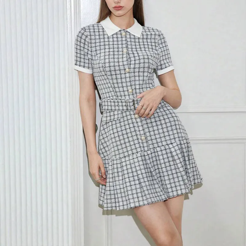 Huili Manufacturer Custom High Quality 2025 Luxury Fashion Designer Preppy Notch Lapel Button Down Belted Plaid Pleated Dress